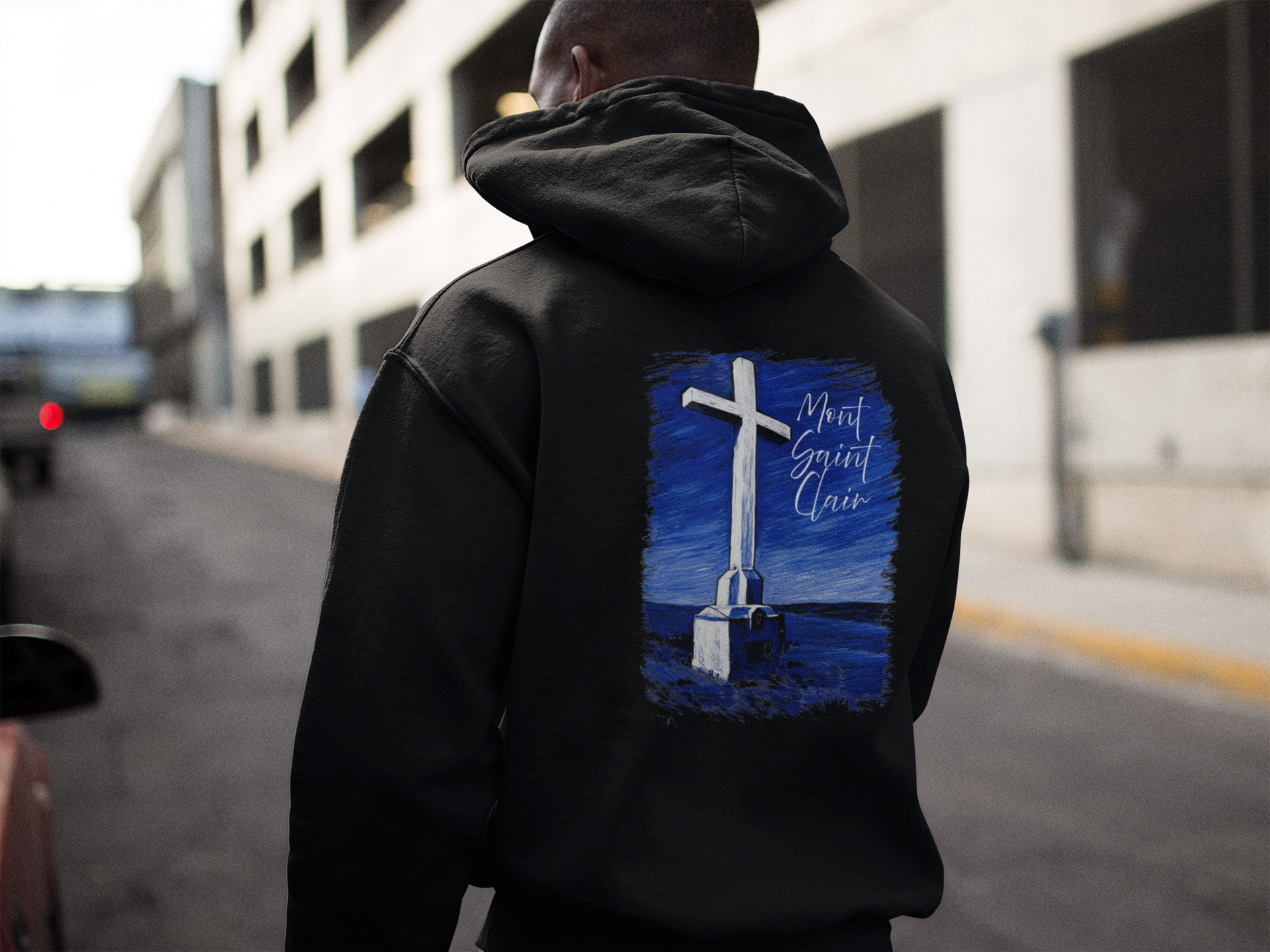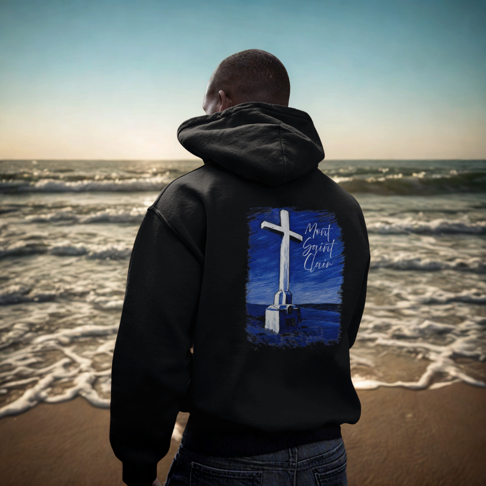 Dans un noir profond et élégant, le sweat à capuche Mont Saint Clair révèle au dos une illustration forte et symbolique : la Croix du Mont Saint-Clair, dominant l’horizon et veillant sur l’étang de Thau.
