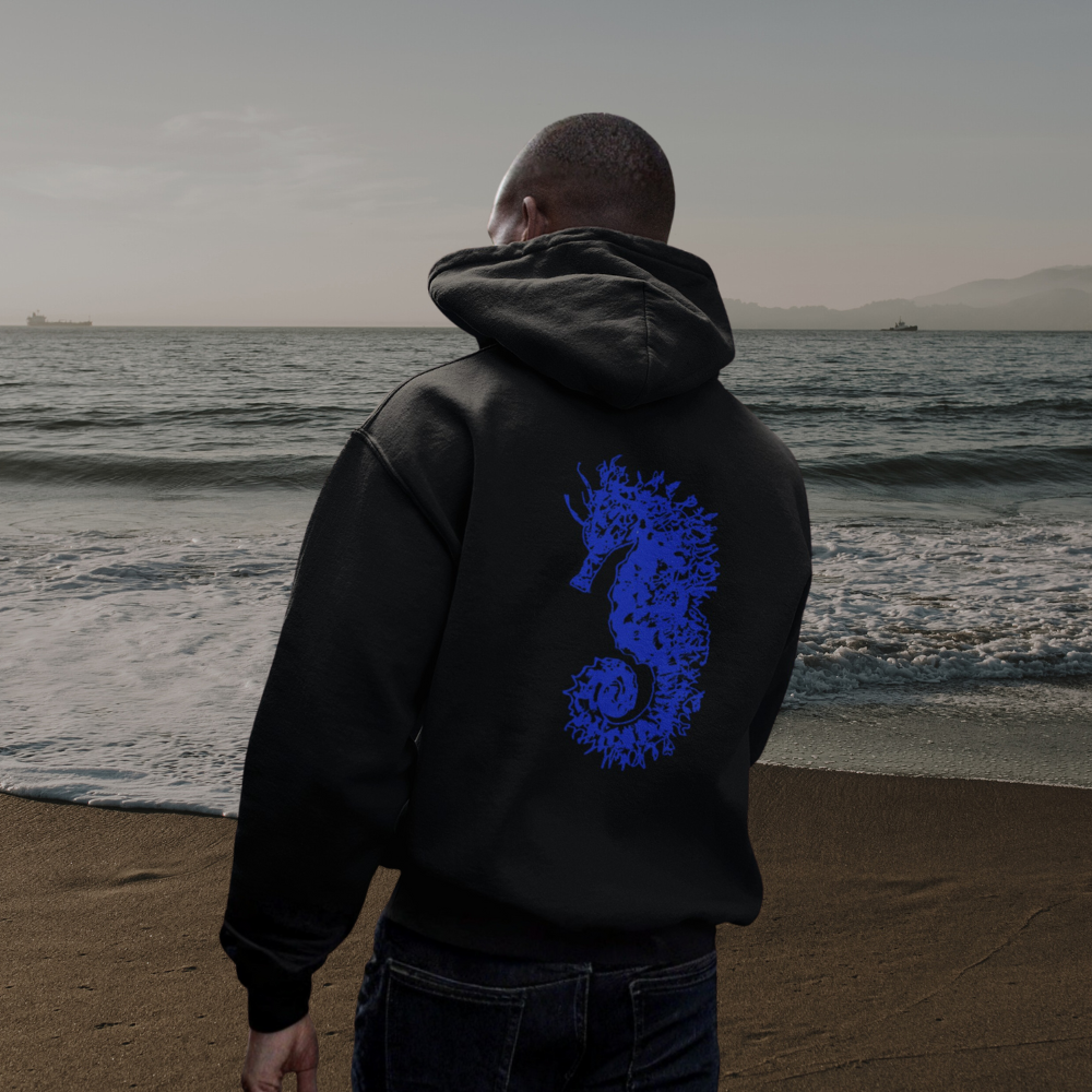 Sur un noir profond et élégant, le sweat à capuche Mont Saint Clair met à l’honneur l’un des symboles les plus précieux et mystérieux du bassin de Thau : l’hippocampe.