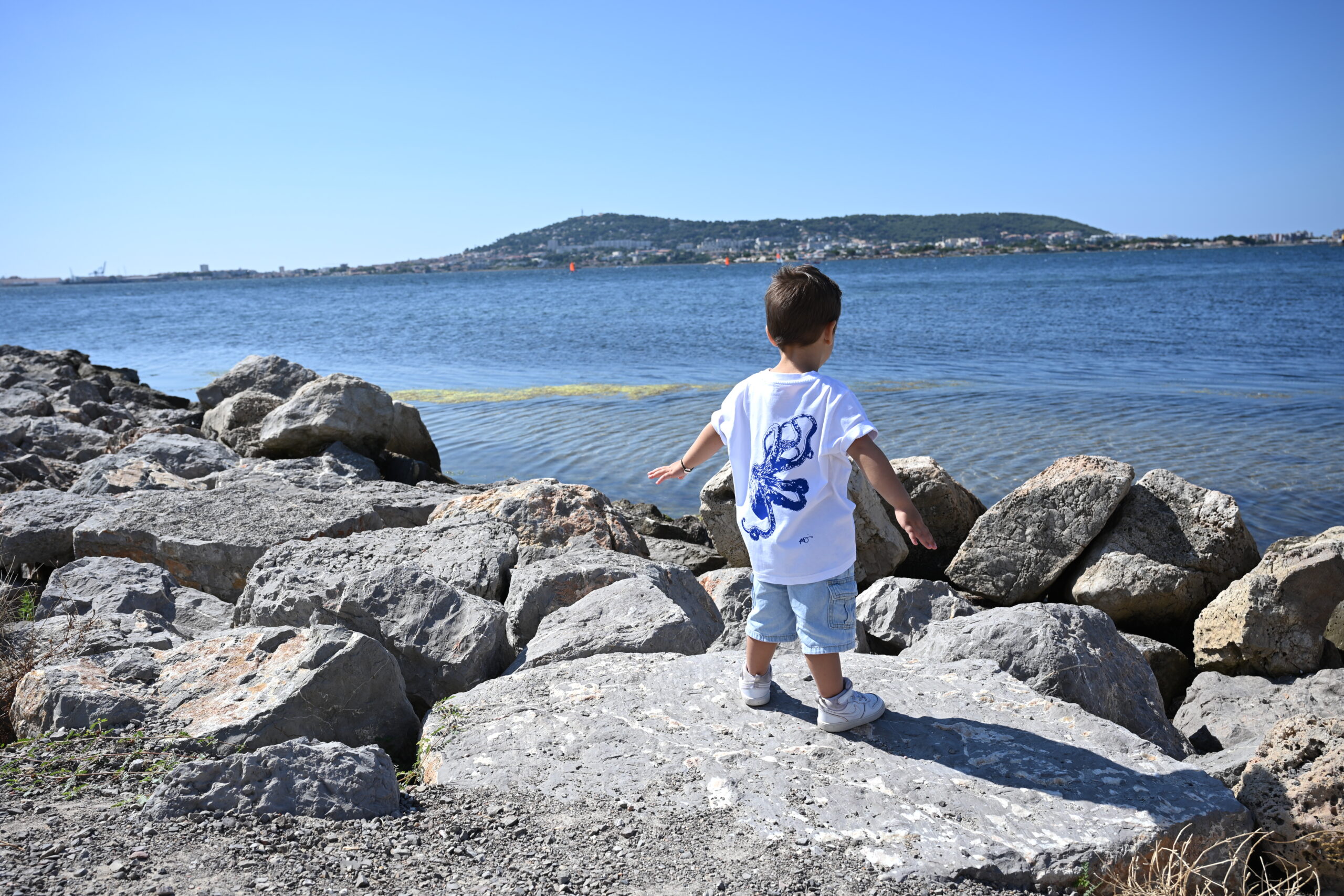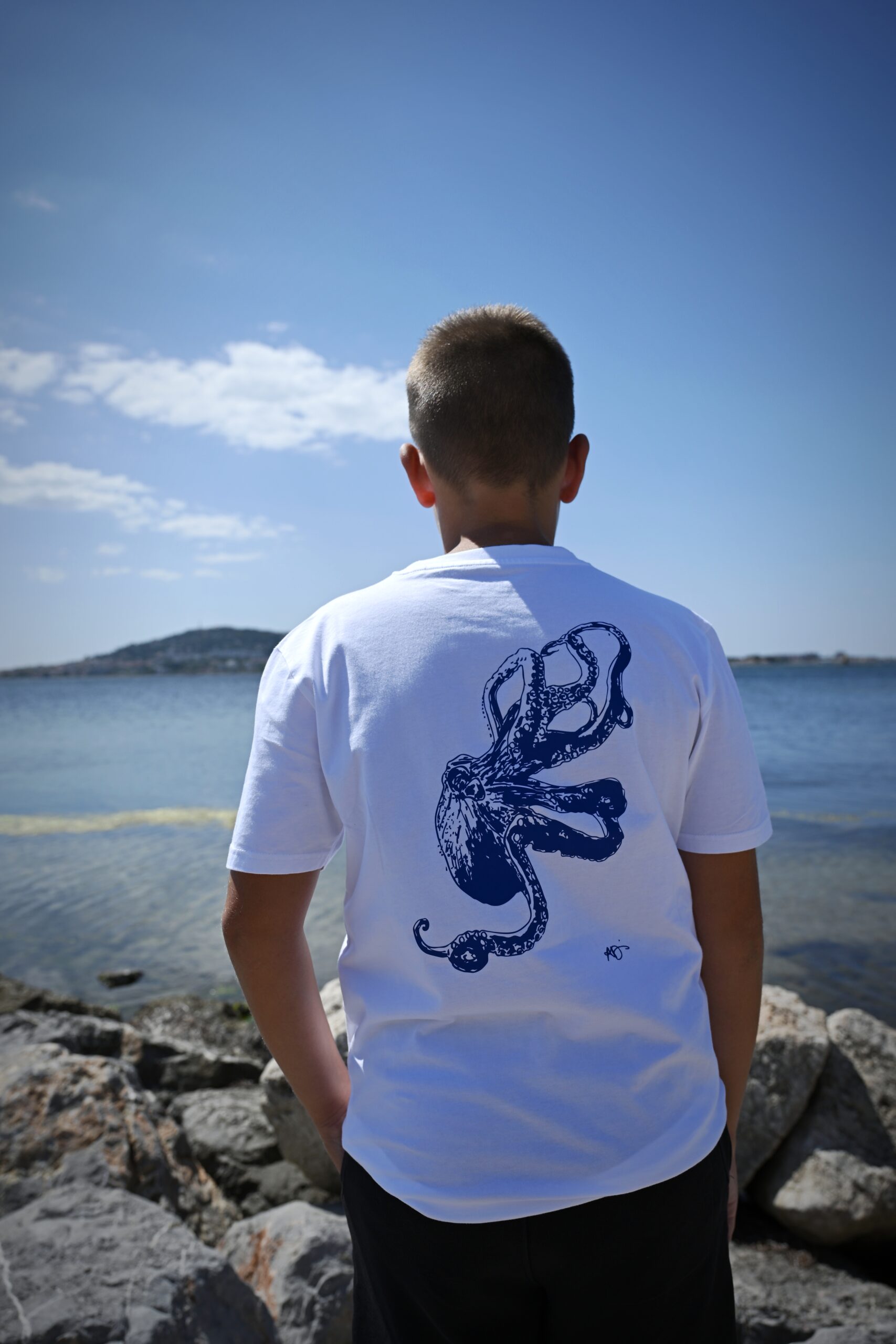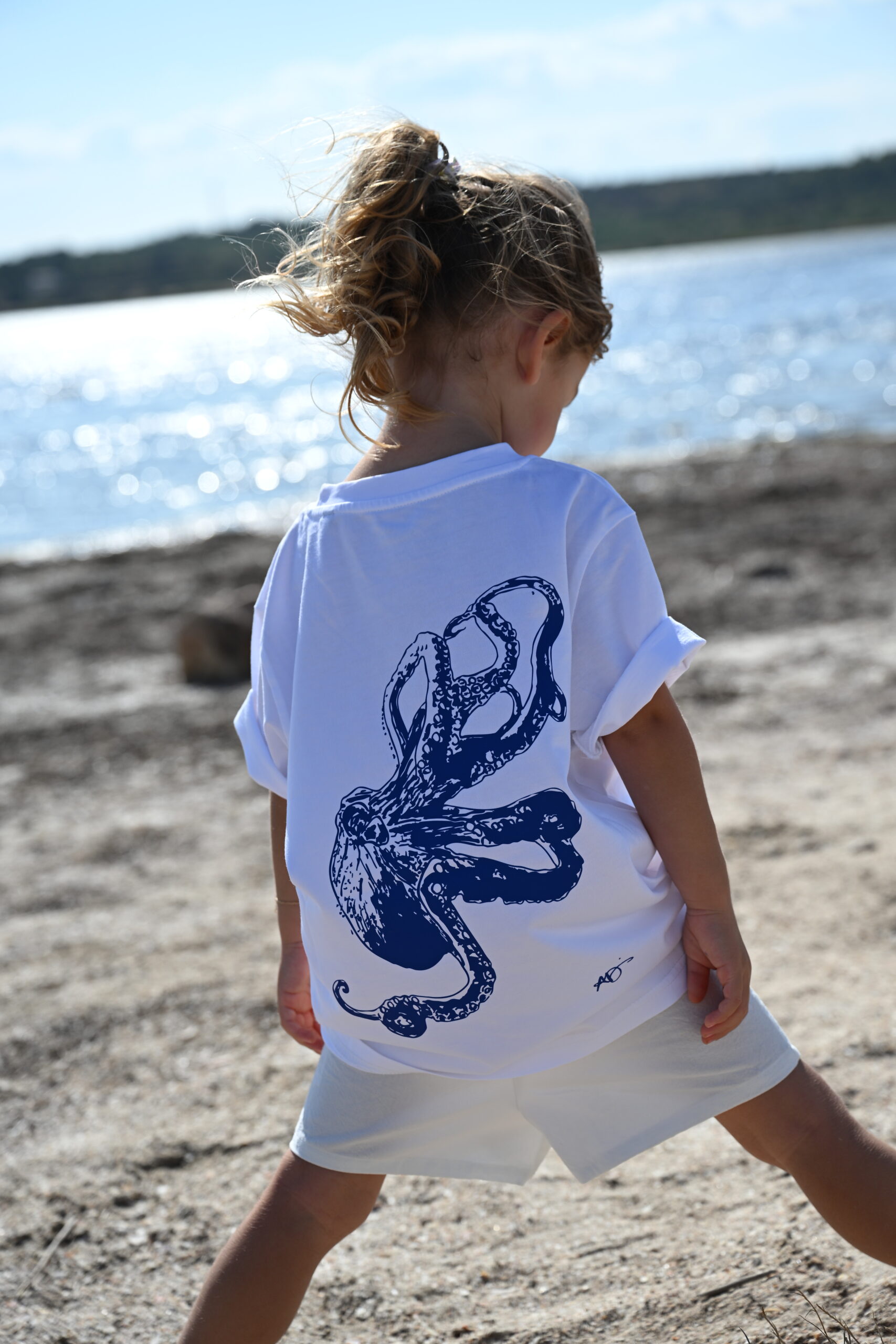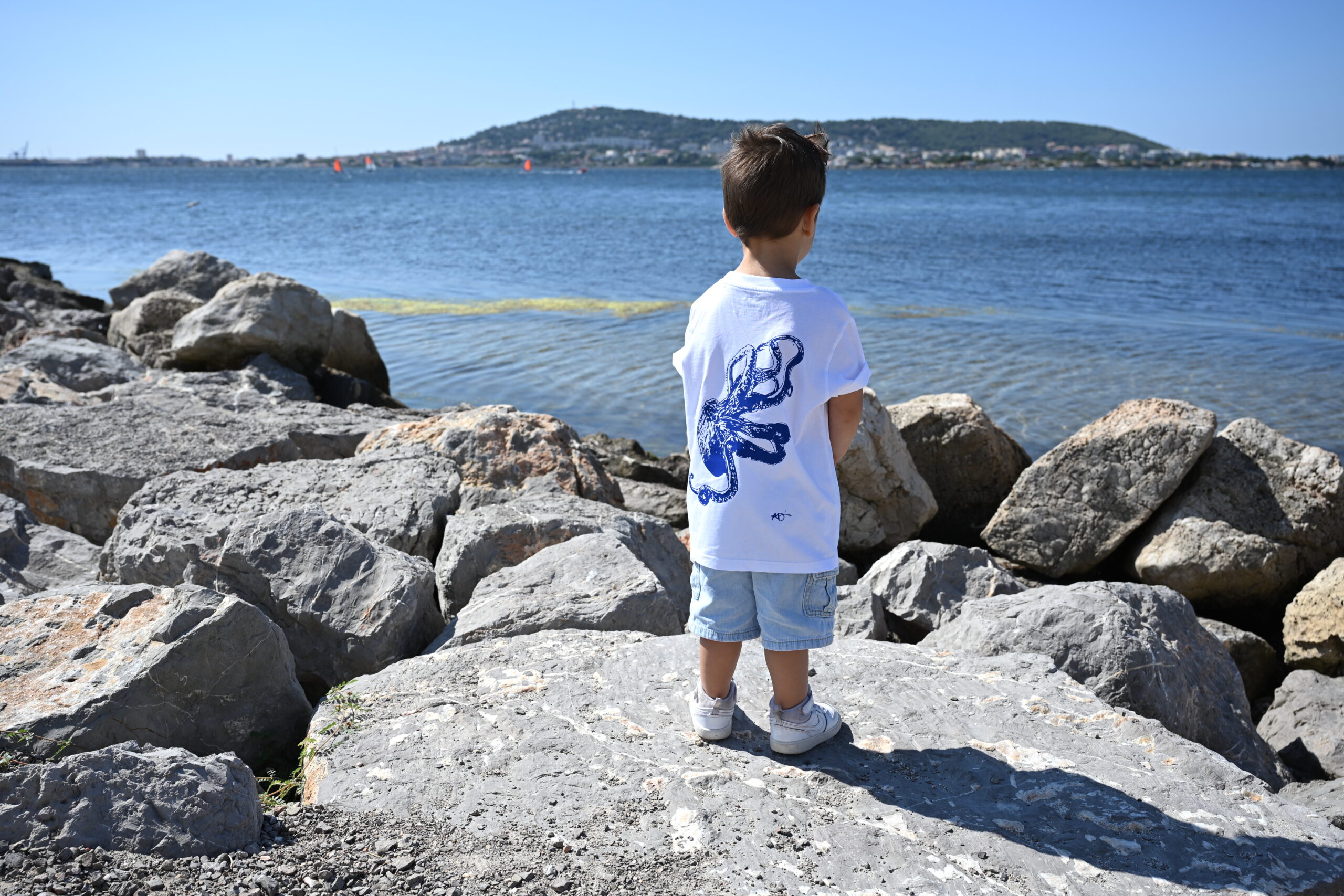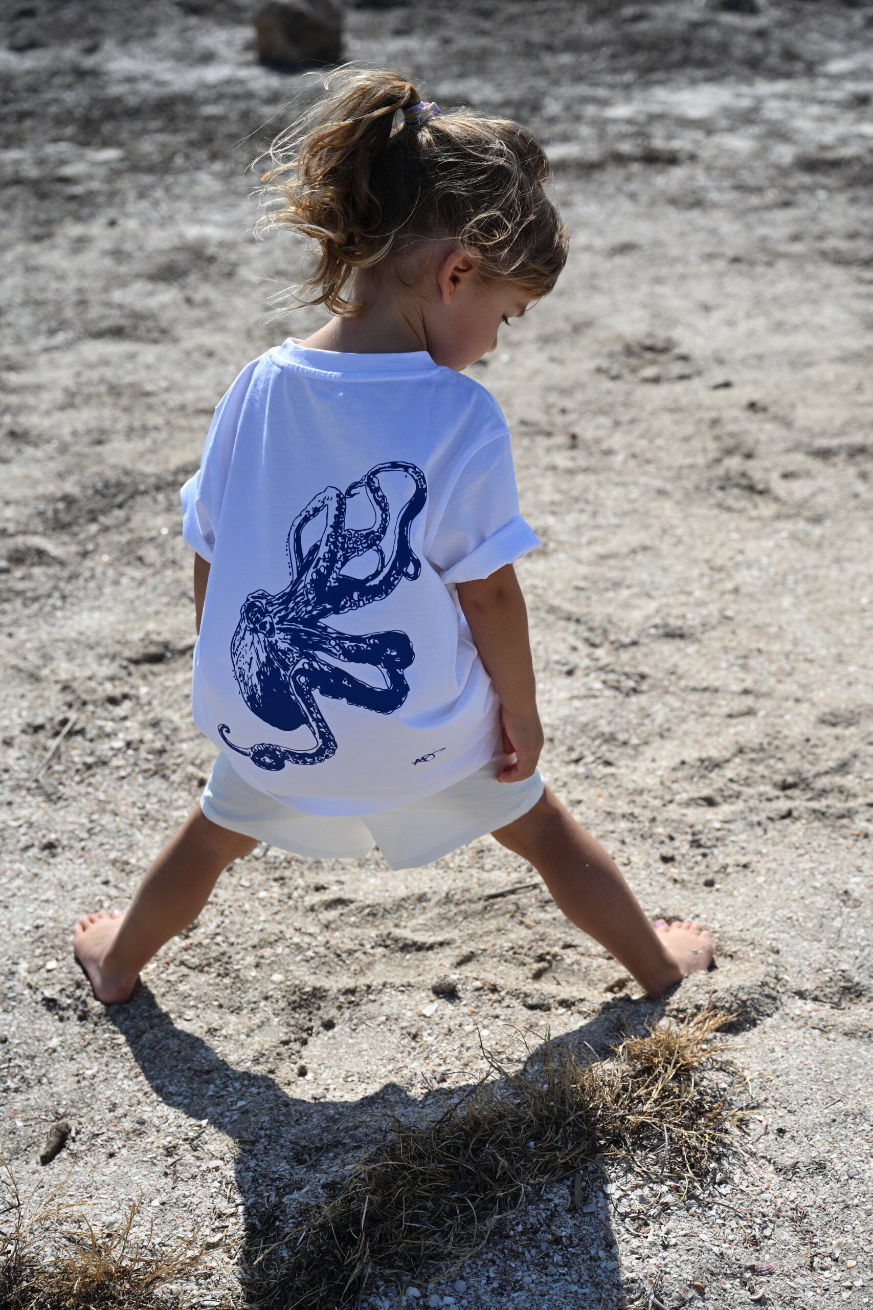 T-shirt enfant Poulpe en coton bio, fabriqué au Portugal, avec une coupe oversize confortable et une illustration exclusive signée Arthur Dupuy.